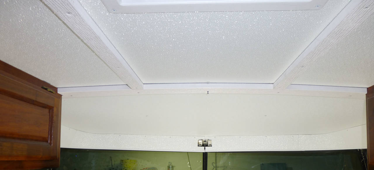 With trim. Properly cut & secured the pieces fit together nicely. Two screws in the ceiling ribs were necessary to prevent sagging of the main panel.