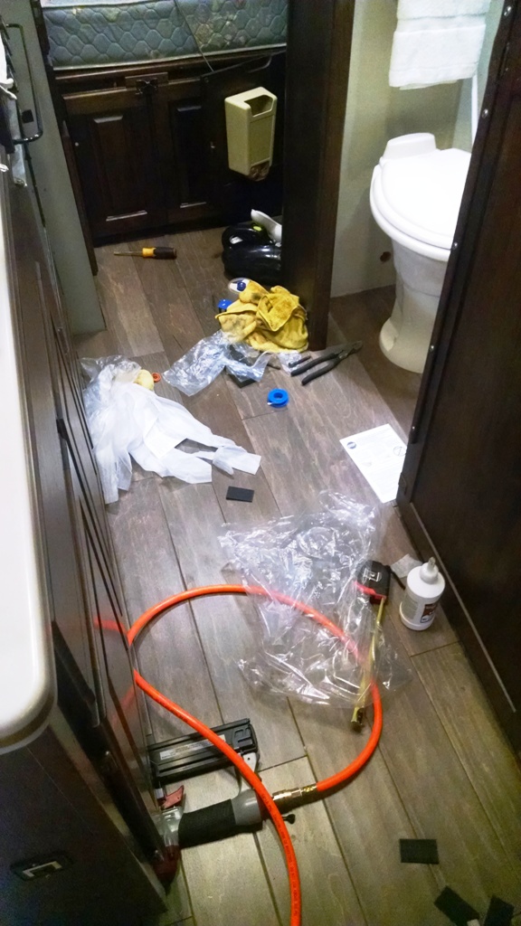 The job is going well at this point... Note the 1/4" (or so) spacers I used around the edge of the floor, to allow room for the floor to shrink and grow due to temperature changes.